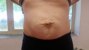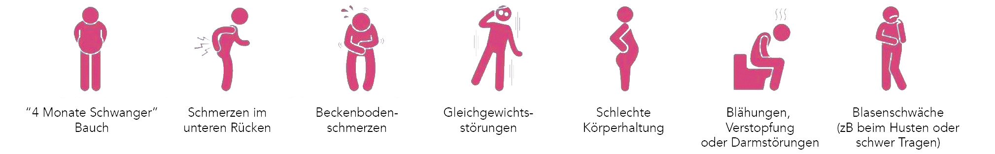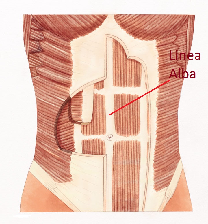 Die beiden Seiten des Muskels „rectus abdominis‘ sind in der Mitte, in vertikaler Richtung entlang der Nabellinie, verbunden durch starke Bindegewebsfaser:  die Linea Alba (lat für Weisse Li. Nie) . Dieses elastische Bindegewebe dehnt sich während der Schwangerschaft mit dem wachsenden Bauch entsprechend seiner Größe aus. Diese Trennung sollte 8-10 Wochen nach der Lieferung geschlossen sein… SOLLTE! Leider ist dies in 8 von 10 Fällen nicht der Fall.